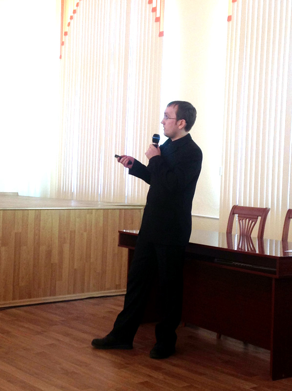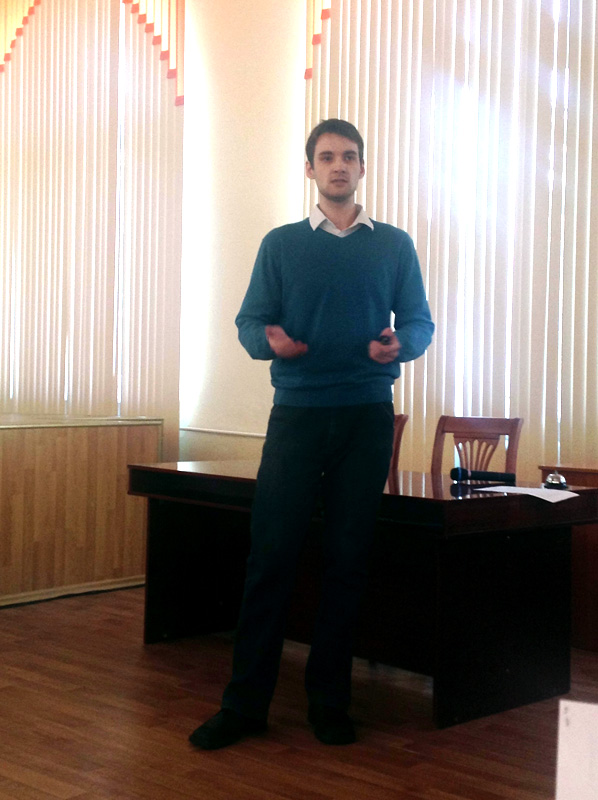 Сергей Аксенов, старший научный сотрудник лаборатории теоретической физики Института физики им. Л.В. Киренского Сибирского отделения Российской академии наук (ИФ СО РАН), на конкурсе-конференции молодых ученых Красноярского научного центра Сибирского отделения РАН в 2013 году. Красноярск.