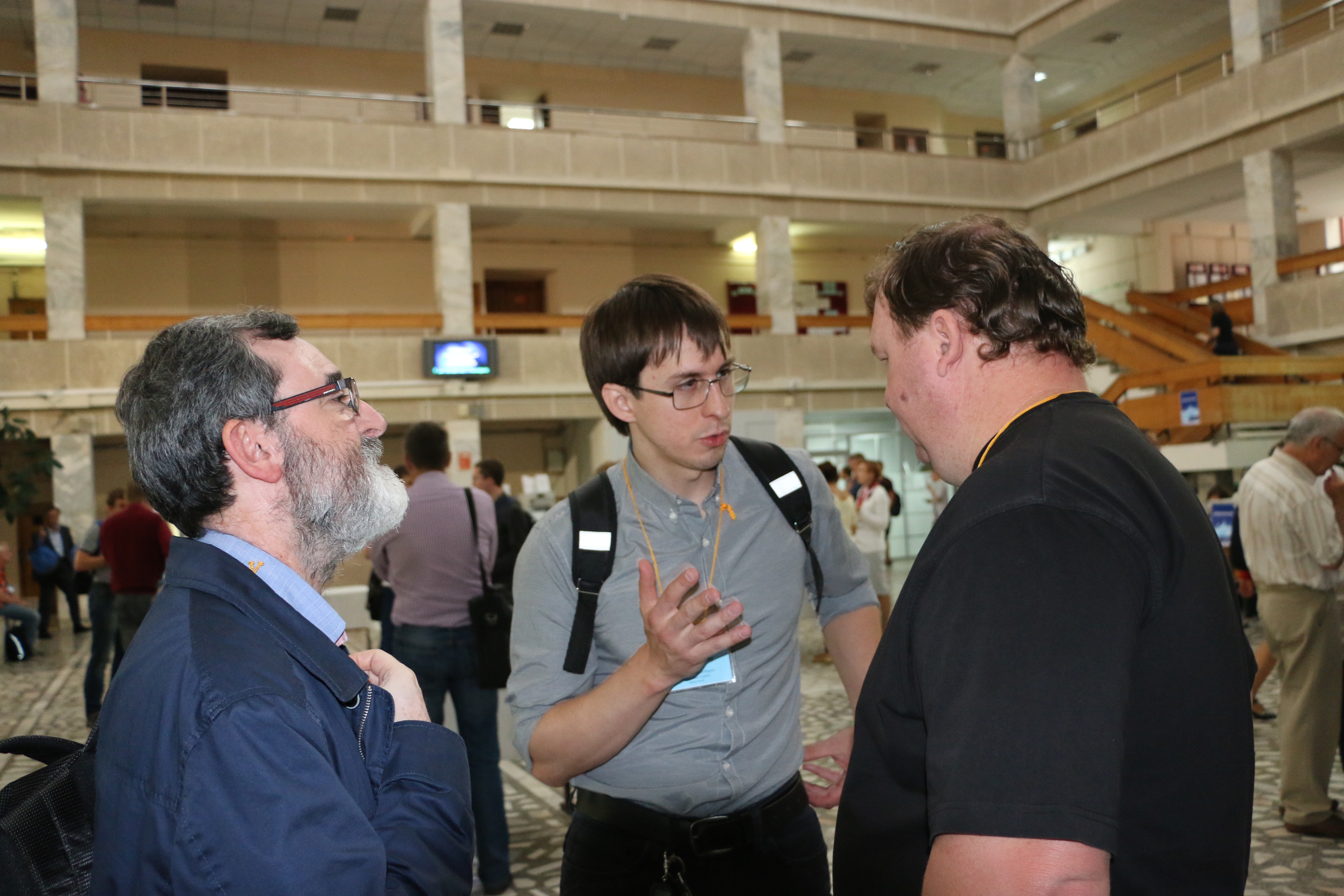 Участники Евро-Азиатского симпозиума «Прогресс в магнетизме» (EASTMAG-2016), организованного и проведенного в Красноярске в августе 2016 года. Слева направо: Хавьер Рубин (Университет Сарагосы, Испания) с Михаилом Платуновым (в центре) и Сергеем Варнаковым, сотрудниками лаборатории физики магнитных явлений Института физики им. Л.В. Киренского Сибирского отделения Российской академии наук (ИФ СО РАН).