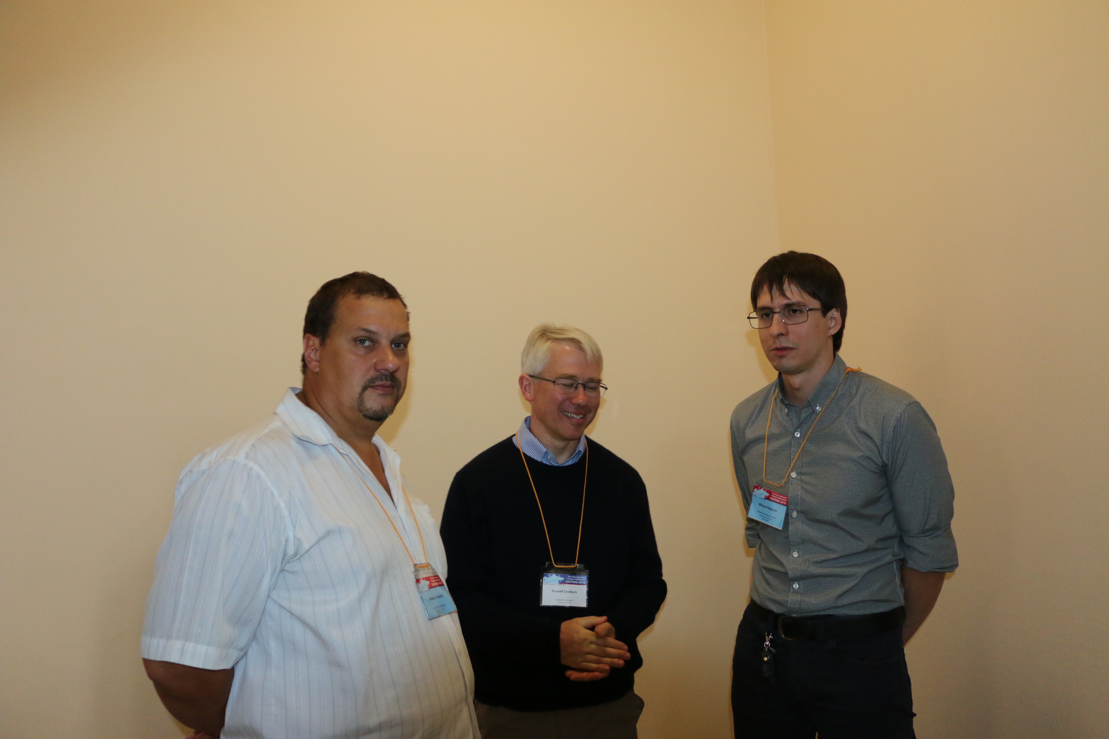 Профессор Рассел Каубёрн (Кавендишская лаборатория, Кембриджский университет, Великобритания) (в центре) с сотрудниками лаборатории физики магнитных явлений Института физики СО РАН Алексеем Соколовым (слева) и Михаилом Платуновым на симпозиуме EASTMAG-2016, Красноярск.