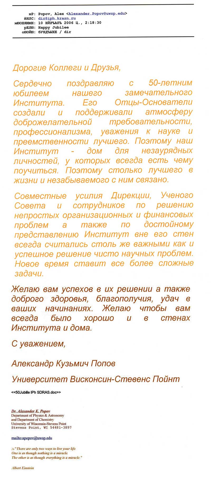 Вы здесь: Главная / Документы / Поздравления с 50-летием Института / Попов Александр Кузьмич. Research Professor Birck Nanotechnology Center Purdue University