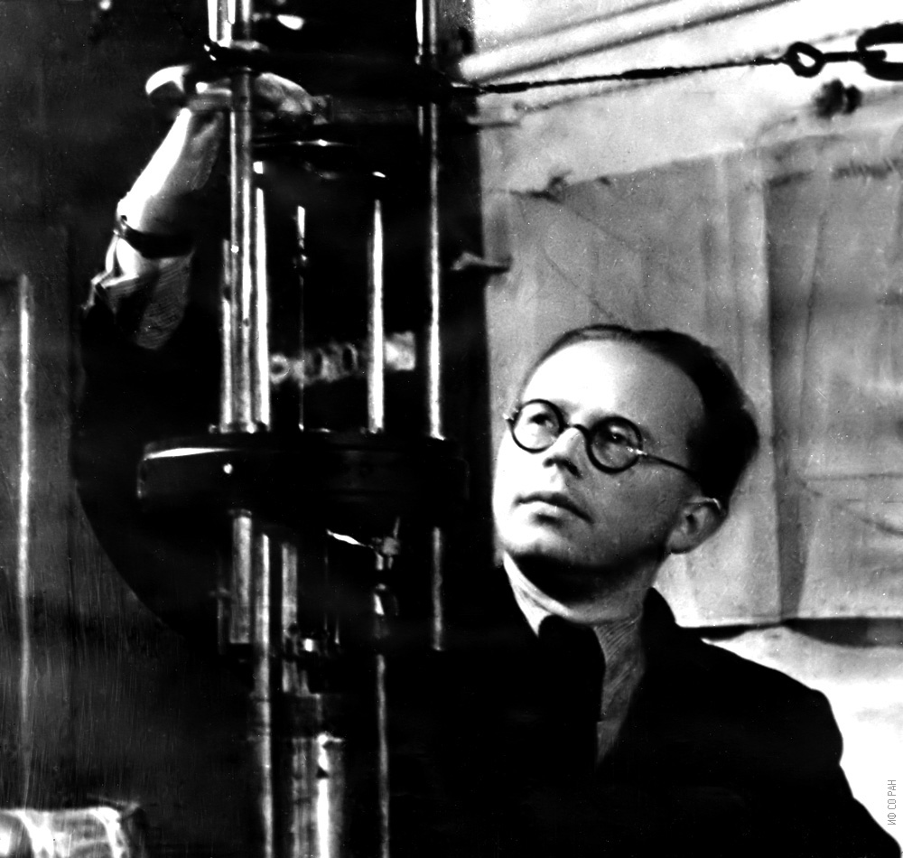 Один из первых аспирантов Л.В. Киренского, Втюрин Николай Иванович в магнитной лаборатории Красноярского государственного педагогического института, за установкой по исследованию температурной зависимости потерь на гистерезис в сильных вращающихся полях, фото 1960 года.