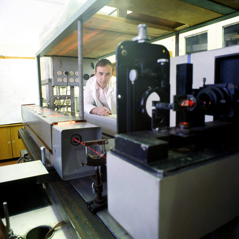 Пирожков Николай Алексеевич, инженер-программист лаборатории молекулярной спектроскопии Института физики им. Л.В. Киренского Сибирского отделения Российской академии наук (ИФ СО РАН), за работой на установке комбинационного рассеяния света. Снимок 1993 года. Красноярск.