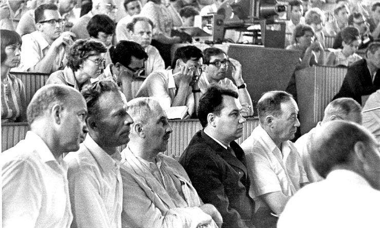 1968 год. В первом ряду: третий слева Р.В. Телеснин, В.А. Буравихин, Л.В.Киренский на Международном симпозиуме по физике тонких магнитных пленок в Иркутске.