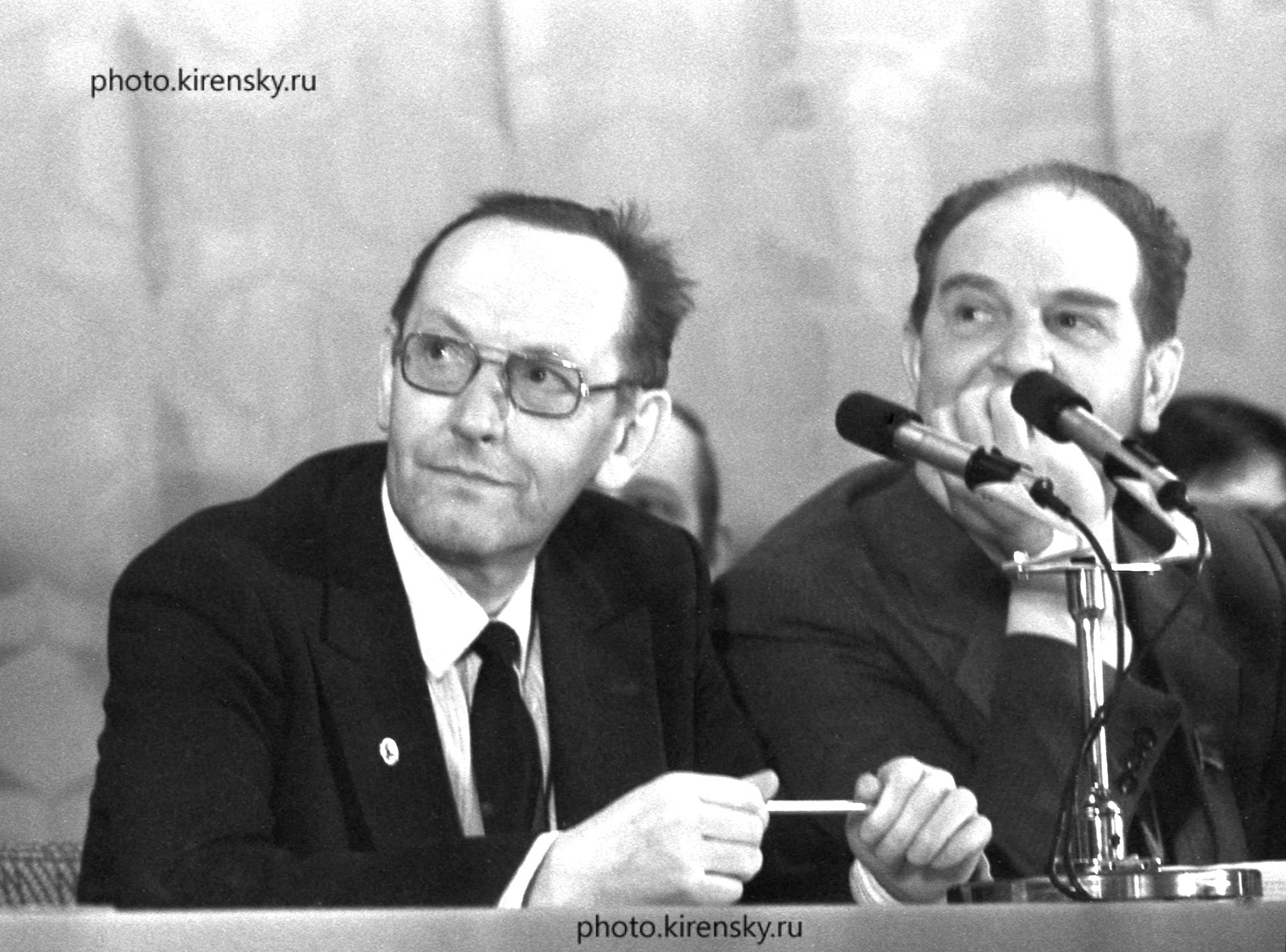 1986 год. Академики Александров К.С. (слева), директор Института физики им. Л.В. Киренского Сибирского отделения Академии наук СССР (ИФ СО АН СССР) и Исаев А.С., председатель Президиума Красноярского научного центра СО АН СССР. Красноярск.