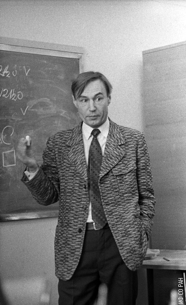 Анистратов А.Т., старший научный сотрудник лаборатории кристаллофизики Института физики им. Л.В. Киренского Сибирского отделения Академии наук СССР (ИФ СО АН СССР), на семинаре лаборатории. Снимок 1979 года. Красноярск.