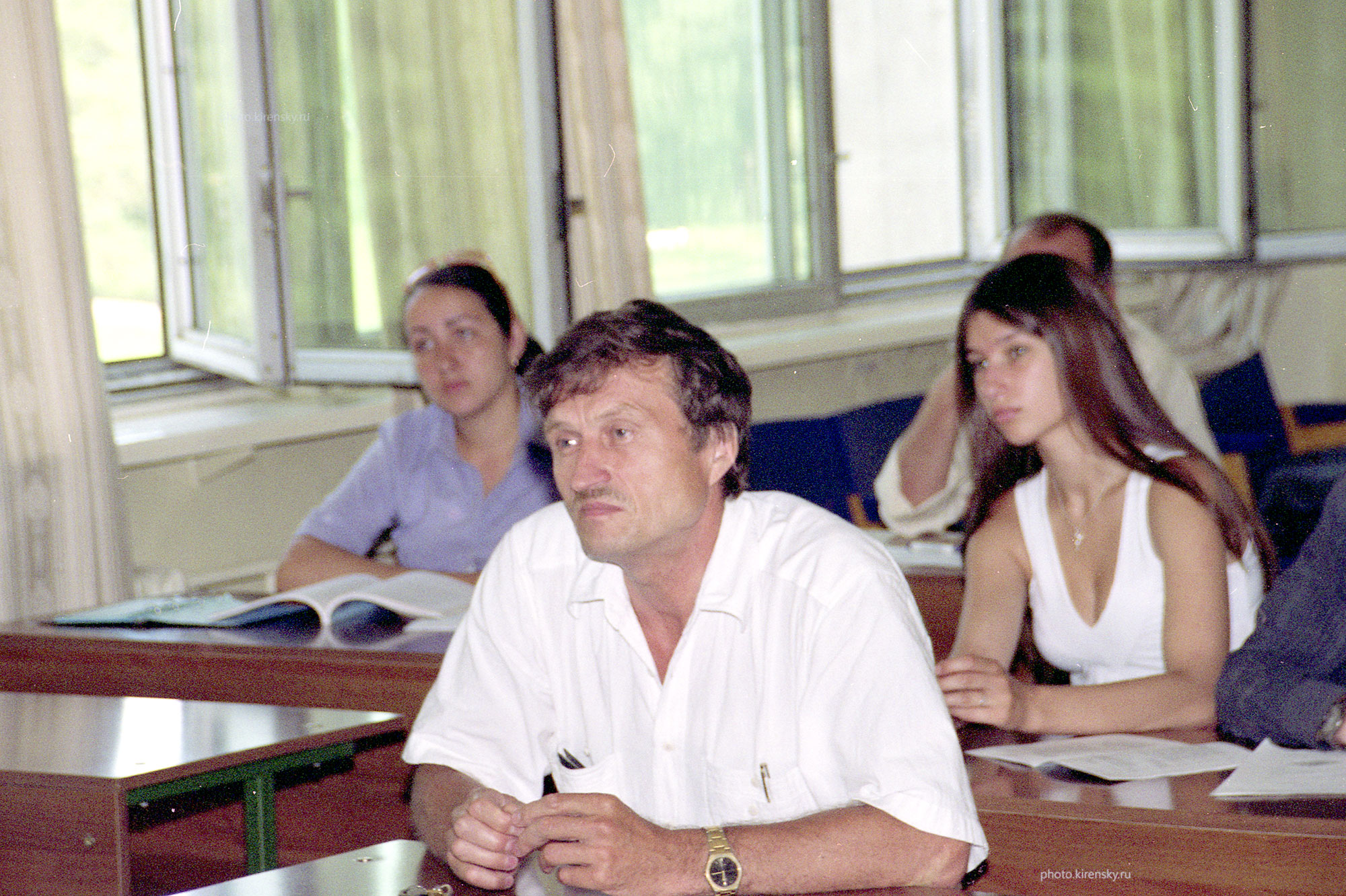 Аплеснин Сергей Степанович, доктор физико-математических наук, ведущий научный сотрудник лаборатории теоретической физики Института физики им. Л.В. Киренского Сибирского отделения Российской академии наук. Заведует кафедрой физики в Сибирском аэрокосмическом университете им. М.Ф. Решетнева (в подразделении "Институт космической техники"), со студентами академии. Снимок 1998 года.