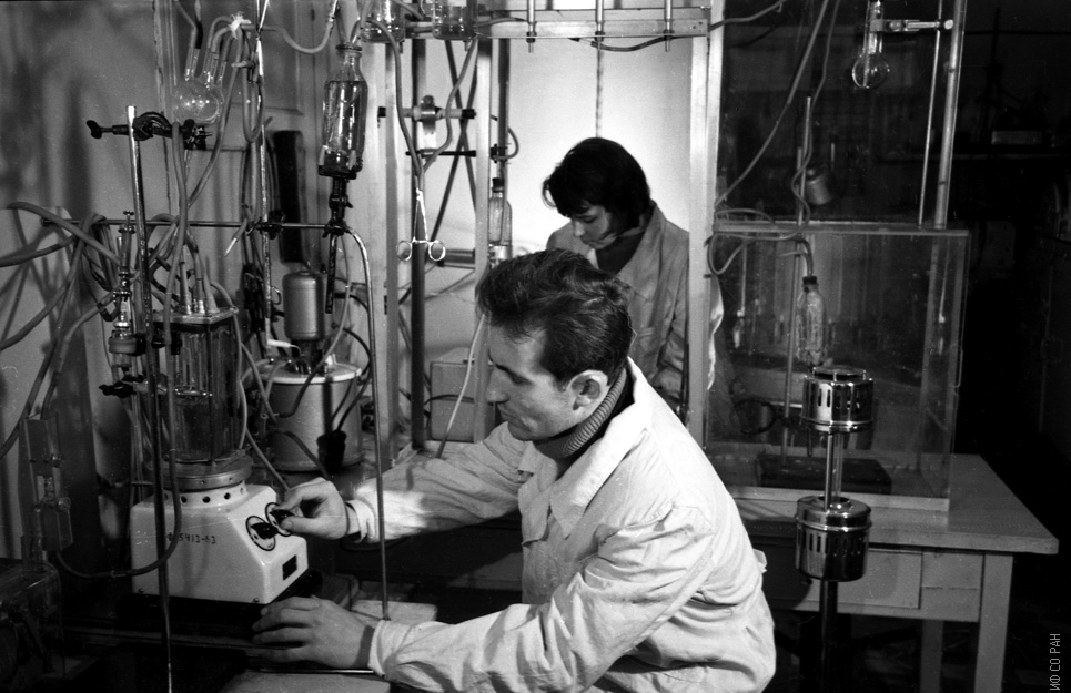 Нефедов В.П. и Сомова Л.А., научные сотрудники отдела биофизики Института физики им. Л.В. Киренского Сибирского отделения Академии наук СССР (ИФ СО АН СССР), за установкой по исследованию физиологического состояния популяции клеток костного мозга, Фото 1970 года. Красноярск.