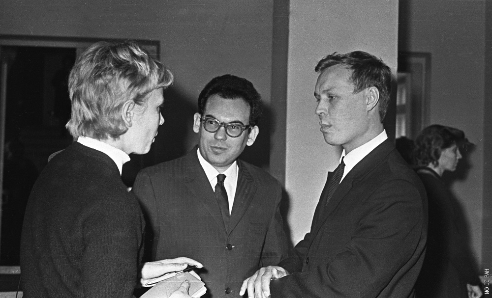 На фото момент интервью Хрусталева Б. П. (справа), младшего научного сотрудника Института физики Сибирского отделения Академии наук СССР (ИФ СО АН СССР), журналисту Красноярского телевидения Черепановой Л., после защиты им диссертации на соискание ученой степени кандидата физико-математических наук. В центре Саланский Н. М., заведующий лабораторией высокочастотных и импульсных свойств тонких магнитных пленок института. 12 января 1970 года. Красноярск.