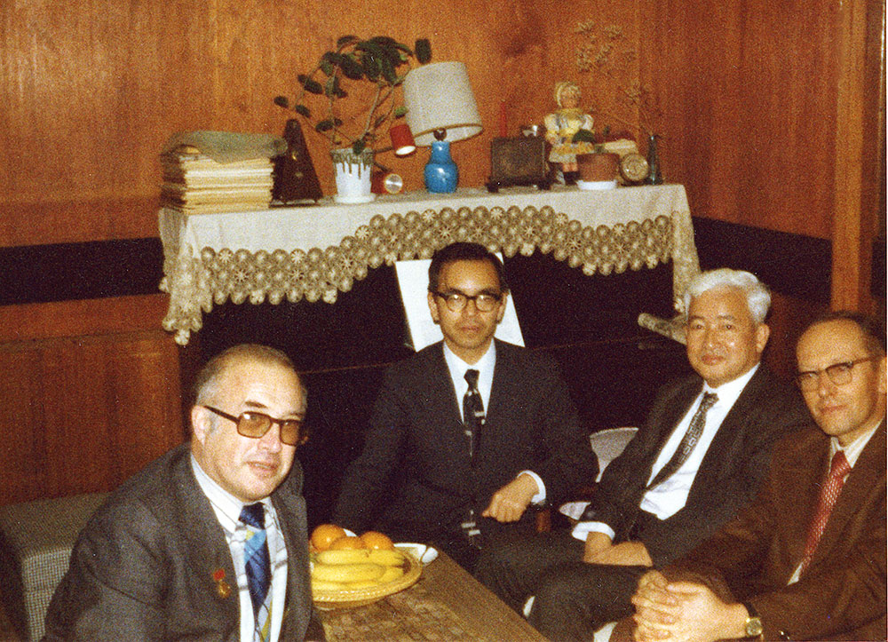 1977 год. Александров К.С. (справа), заместитель директора по научной работе Института физики им. Л.В. Киренского Сибирского отделения Академии наук СССР (ИФ СО АН СССР), во время поездки в Японию с академиком Шуваловым Л.А.(слева) для подготовки второго советско-японского семинара.