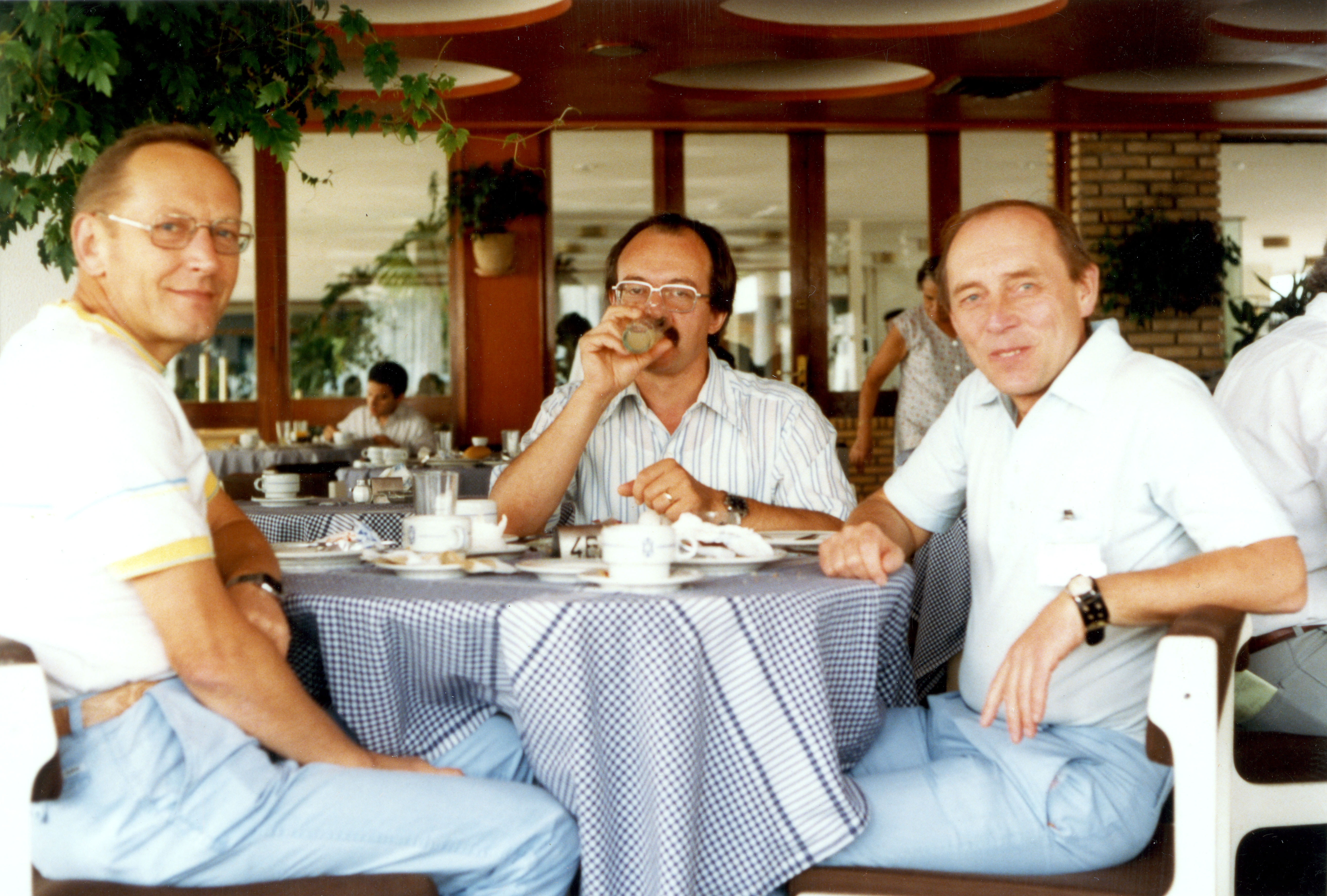 Завтрак в отеле. Александров К.С. (слева), директор Института физики им. Л.В. Киренского Сибирского отделения АН СССР (СО АН СССР с 1991 года - СО РАН) (слева), во время поездки в Испанию на Европейскую конференцию по сегнетоэлектричеству, Бадельмаден, сентябрь 1983 года.