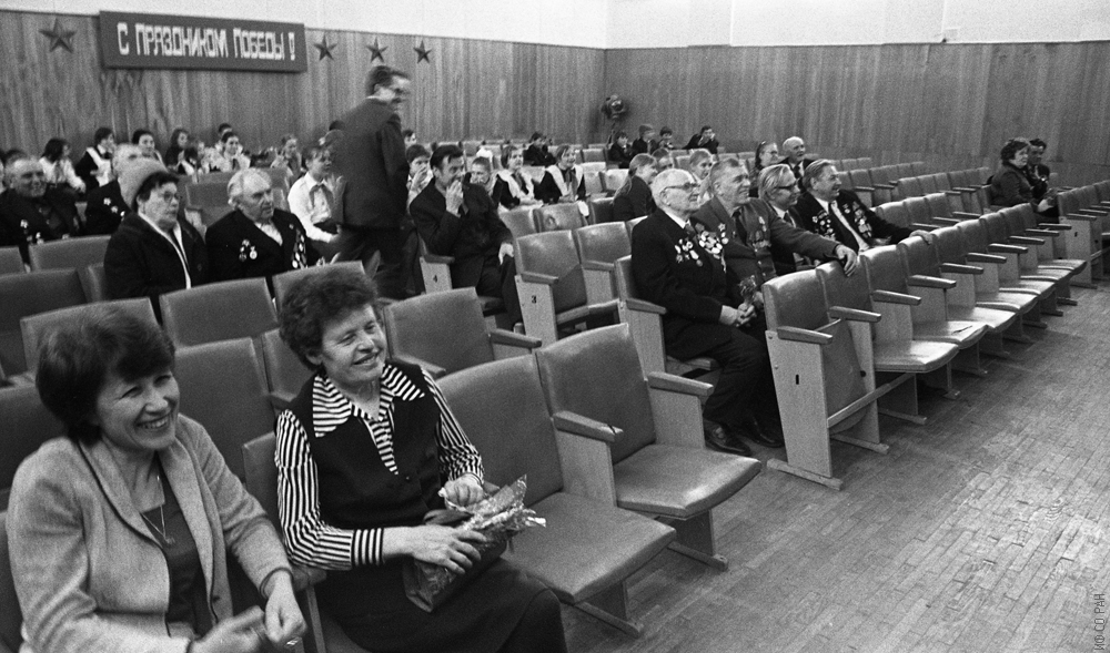 Перед началом торжественного заседания, посвященного Дню Победы 9 мая. Конференц-зал Красноярского научного центра СО АН СССР. В первом ряду Л.М Хрусталева (слева) и А.П. Смолянинова - начальник отдела кадров Института физики. 1985 год.