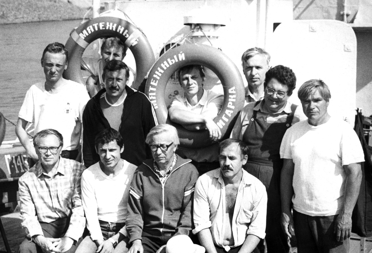 1978 год. Участники одной из научных экспедиций отдела биофизики Института физики им. Л.В. Киренского Сибирского отделения Академии наук СССР (ИФ СО АН СССР) на судне «Мятежный». Экспедиция проводилась по программе изучения природных ресурсов, называлась она «Чистый Енисей» и входила в супер программу «Сибирь» (супер программа "Сибирь" это программа, созданная по инициативе Президиума Сибирского отделения АН СССР в 1978 году). На фото сотрудники отдела биофизики вместе с командой корабля. Сидят (слева направо): Спиров В.В., Лопатин В.Н., Сидько Ф.Я. Стоят: второй слева Сидько А.Ф., крайний справа Ерошин Н.С., рядом с ним Апанасенко А.Д.,