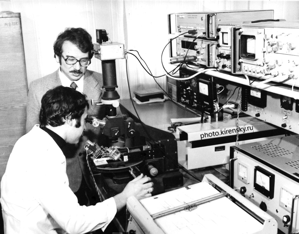пленок Института физики им. Л.В. Киренского Сибирского отделения Академии наук СССР (ИФ СО АН СССР), за одной из установок по изучению свойств пленок. Установка разработана и собрана в лаборатории. Снимок 1977 года. Красноярск.