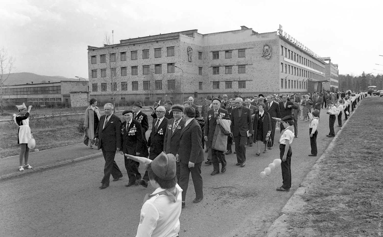 Участники торжественного заседания, посвященного Дню Победы, направляются к могиле академика Л.В.Киренского, чтобы возложить цветы. 9 мая 1981 года.