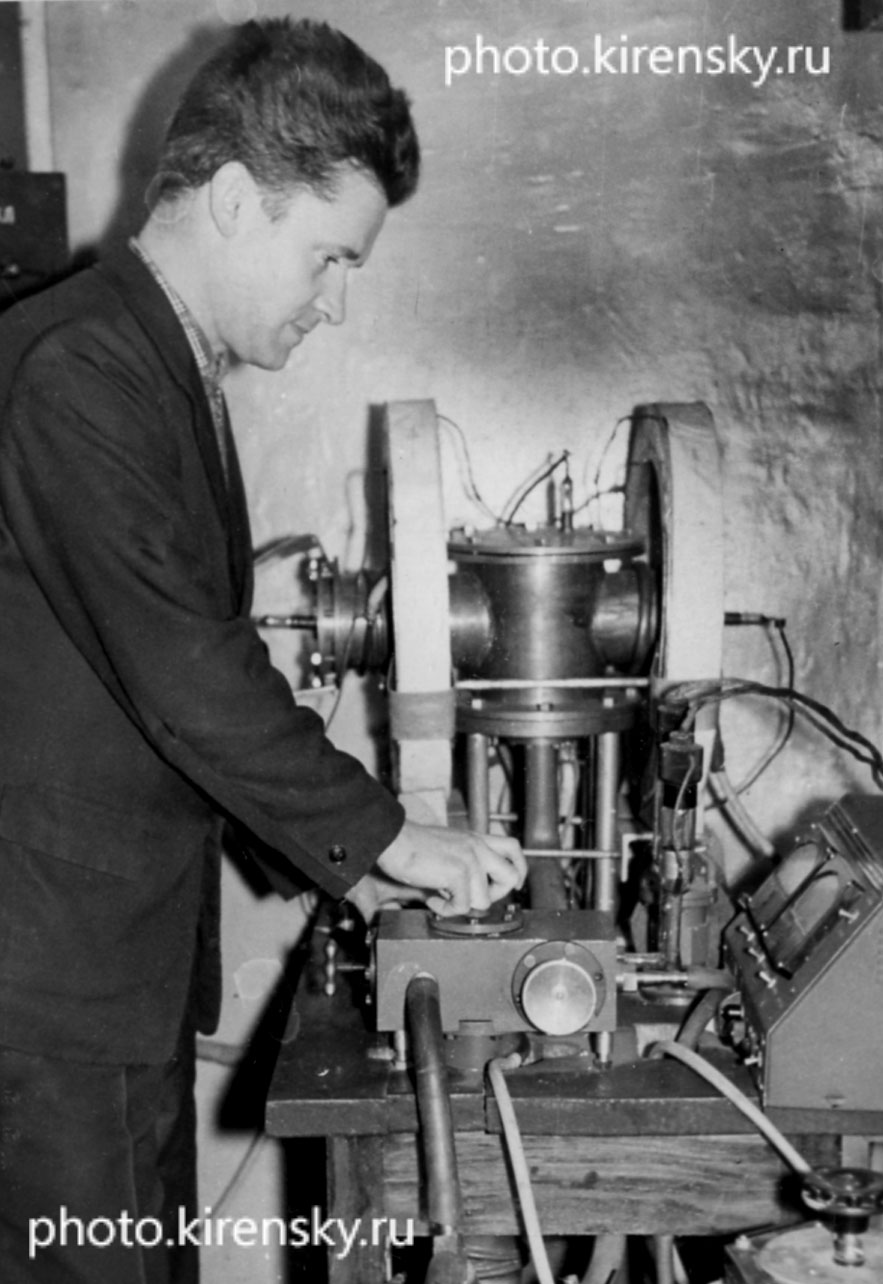 В лаборатории структурных свойств тонких магнитных плёнок Института физики Сибирского отделения Академии наук СССР (ИФ СО АН СССР) выращивали монокристаллические ферромагнитные пленки. Впервые в СССР, сотрудниками лаборатории была применена электронная микроскопия для изучения доменной структуры плёнок. Младший научный сотрудник Павел Степанович Галепов за установкой для получения плёнок методом катодного распыления. Снимок 1967 года. Красноярск.