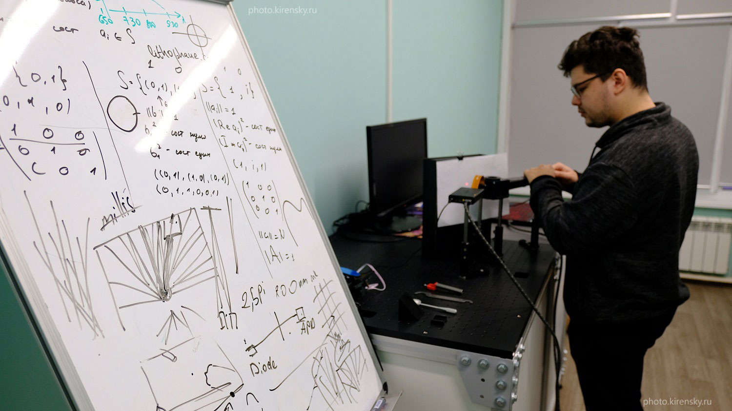 Ким Пётр Николаевич, инженер лаборатории фотоники молекулярных систем Института физики им. Л.В. Киренского Сибирского отделения Российской академии наук, у разрабатываемого им компонента установки лидара (пространственный фазовый модулятор света). Март 2025 года.