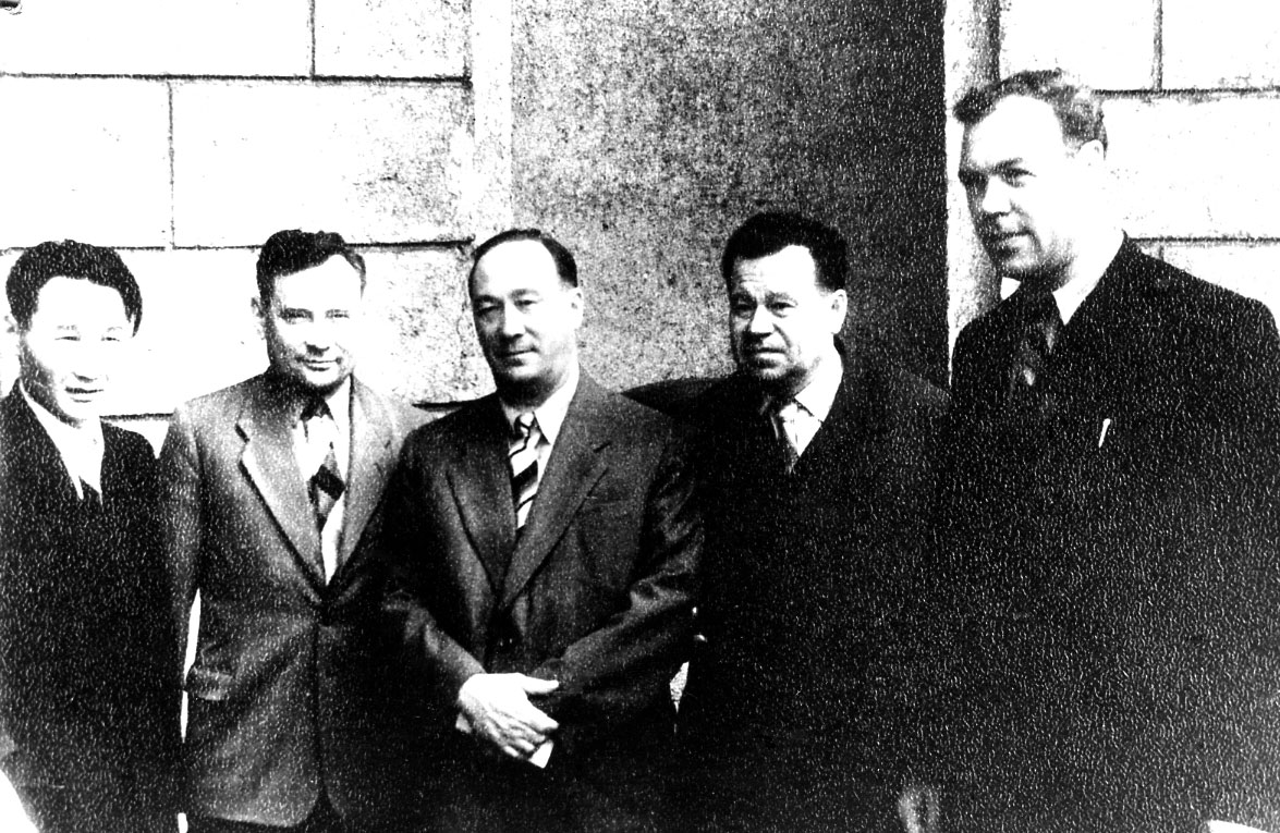 !967 год. Слева направо: В.Д. Дылгеров (один из первых аспирантов Л.В. Киренского), Н.З. Мирясов, Л.В. Киренский, Г.В. Спивак (профессор Московского государственного университета), А.И Дрокин (заместитель директора по научной работе Института физики Сибирского отделения Академии наук СССР (ИФ СО АН СССР).
