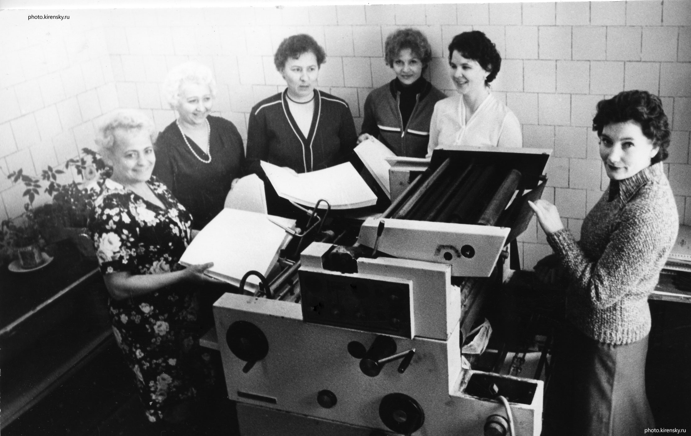 Коллектив печатного цеха Института физики им. Л.В. Киренского Сибирского отделения Академии наук СССР (ИФ СО АН СССР). Слева направо: Пшаничная Тамара Алексеевна, Максименко Зинаида Евдокимовна, Стутко Мария Ивановна, Чеснокова Валентина Николаевна, Стутко Татьяна Николаевна, Старостина Ольга Ивановна, снимок 1985 года. Красноярск.