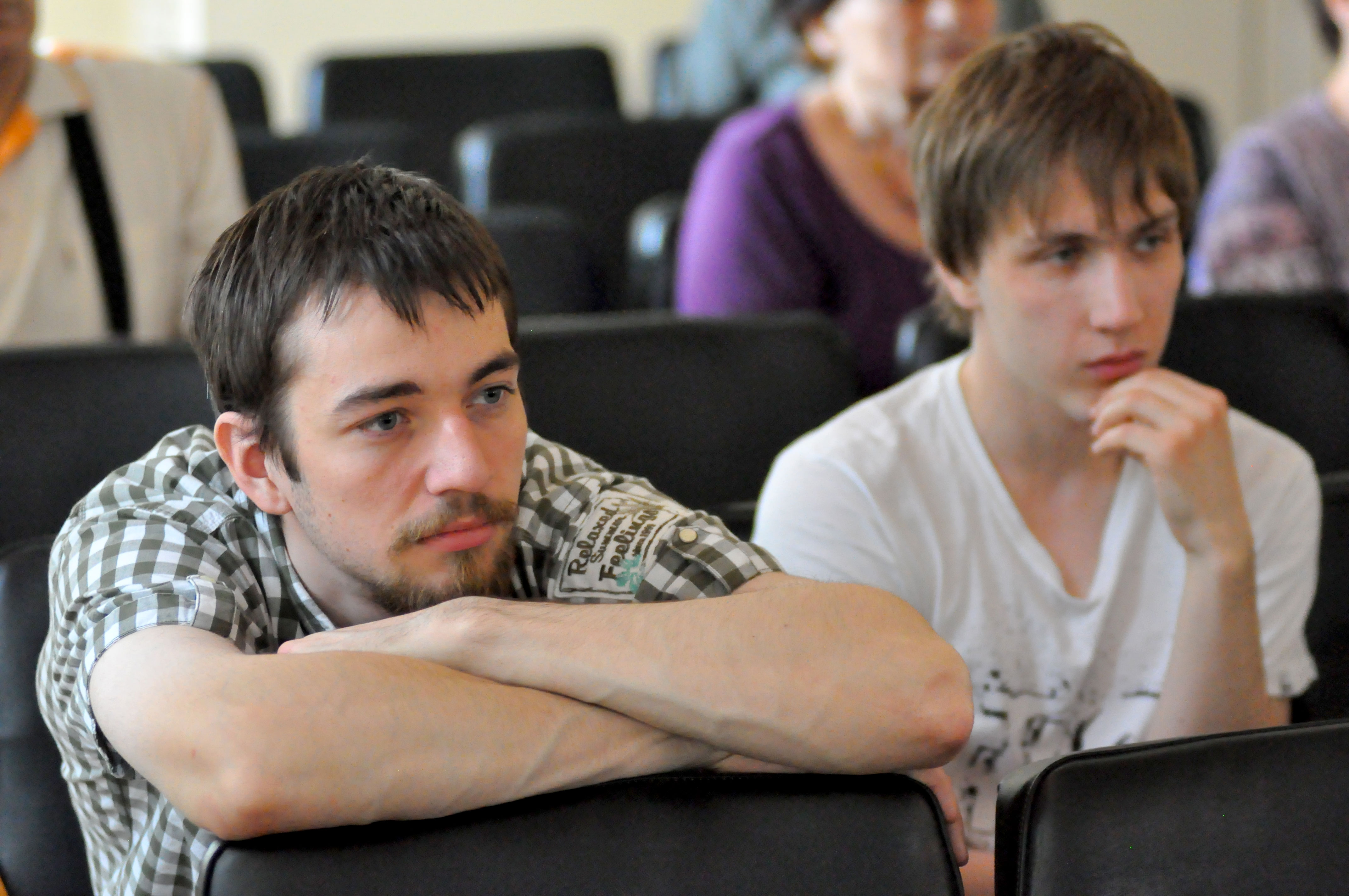 2015 год, май. Валерий Кузьмин (справа) и аспирант Максим Высотин, сотрудники Института физики им. Л.В. Киренского Сибирского отделения Российской академии наук (ИФ СО РАН), на заседании ученого Совета института. Красноярск.