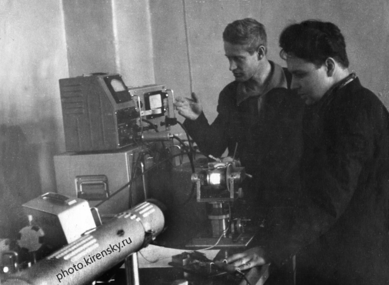 1966 год. Ведущий инженер А.В. Малаховский и начальник электронно-вычислительной машины «Урал-2» М.Г. Мальбин, сотрудники Вычислительного центра Института физики Сибирского отделения Академии наук СССР (СО АН СССР с 1991 года СО РАН), у макета запоминающего устройства на тонких ферромагнитных пленках.