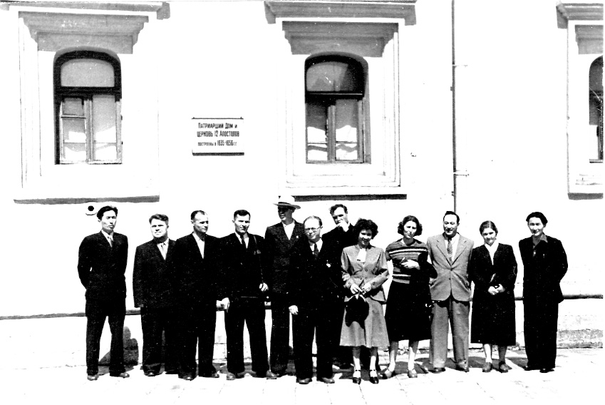 Май 1956 года. В Москве состоялась Международная конференция по магнетизму. В ней приняло участие 16 красноярских физиков-магнитологов с одиннадцатью докладами. На фото, слева направо: В.С. Черкашин, Н.И. Судаков, В.Ф. Ивлев, А.Я. Власов, В.С. Марков, Н.И. Втюрин, А.И. Дрокин, Л.Н. Асеева, Н.В. Морготнова, Л.В. Киренский, З.Я. Киренская, В.Д. Дылгеров.