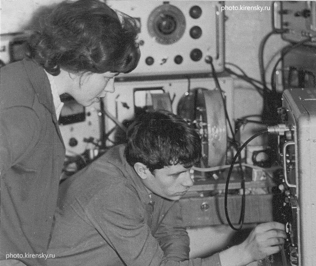 Морозова Тамара Петровна, инженер и лаборант Соколов А., сотрудники лаборатории физики магнитных явлений, за настройкой установки для исследования ядерного магнитного резонанса в тонких магнитных плёнках. Фото 1967 года.