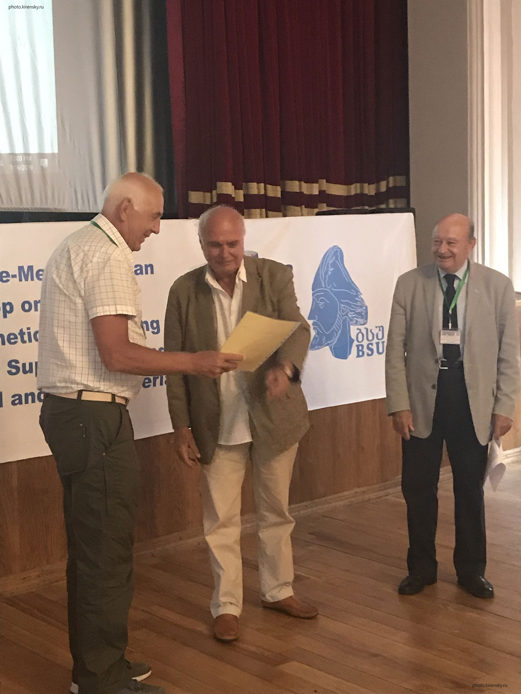 2020 год. Овчинников Сергей Геннадьевич (слева), заведующий лабораторией физики магнитных явлений Института физики им. Л.В. Киренского Сибирского отделения Российской академии наук в Батуми на конференции. Прием Овчинникова в члены Европейской средиземноморской академии искусств и наук. Далее на снимке крайний справа профессор А. Мамалис (Греция).