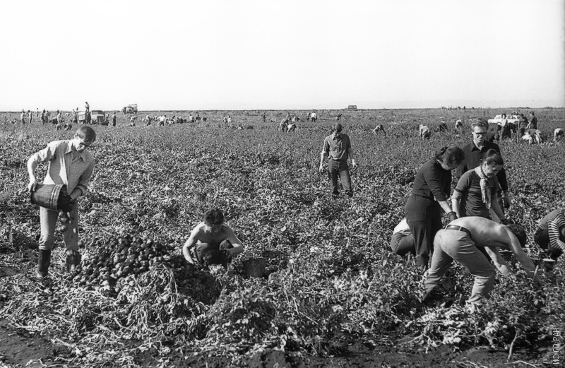 В Советском Союзе существовала традиция, заключающаяся в организации помощи уборки урожая в колхозах и совхозах. Такая традиция существовала и в Красноярском крае. На фото запечатлен один из дней выезда сотрудников института на уборку урожая картофеля в Емельяновский район, расположенный вблизи Красноярска, фото 1974 г.