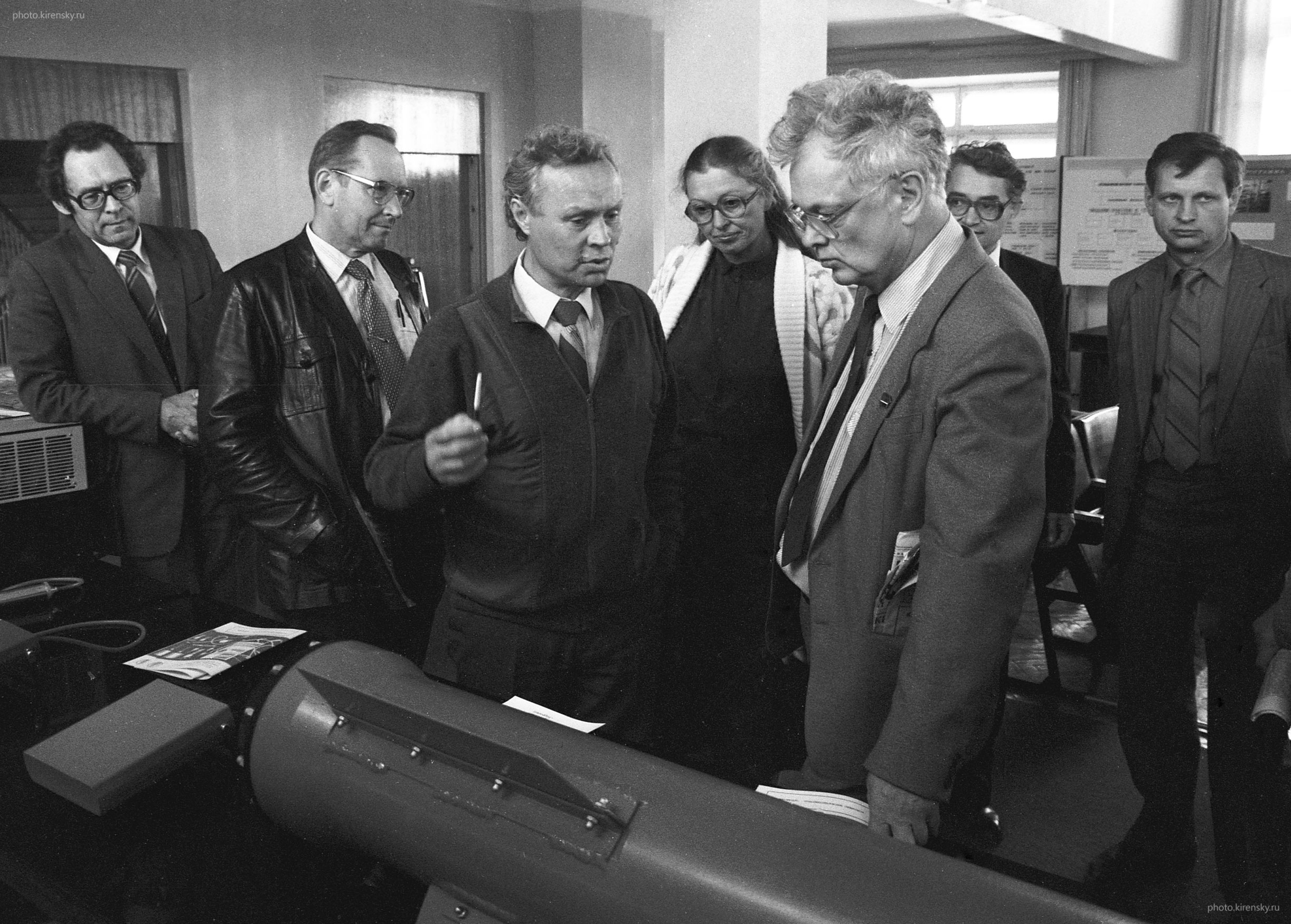 1988 год. На выставке достижений Института физики им. Л.В. Киренского Сибирского отделения Академии наук СССР (ИФ СО АН СССР), подготовленной к визиту Первого секретаря ЦК КПСС Михаила Сергеевича Горбачева в холле института. Слева направо: Якубайлик Эдуард Константинович, ученый секретарь института, академик Александров Кирилл Сергеевич, директор института, Хрусталев Борис Петрович, заместитель директора по научной работе и заведующий лабораторией сильных магнитных полей (дает пояснение гостю). На заднем плане: Шабанов Василий Филиппович, председатель Красноярского филиала Сибирского отделения Академии наук СССР, Бузник Вячеслав Михайлович, секретарь партийной организации Красноярского филиала и руководитель группы "Строение твердых электролитов и диэлектриков" в лаборатории кинетических процессов Института физики.