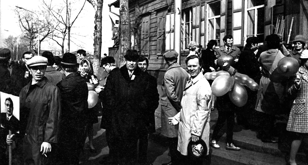 1974 год. Первомайская демонстрация трудящихся Красноярска. Колонна Института физики им. Л.В. Киренского Сибирского отделения Академии наук СССР. На фото (в центре) Баев А.И, заместитель директора института по общим вопросам, Хрусталев Б.П. (в белом плаще), заведующий лабораторией сильных магнитных полей института.