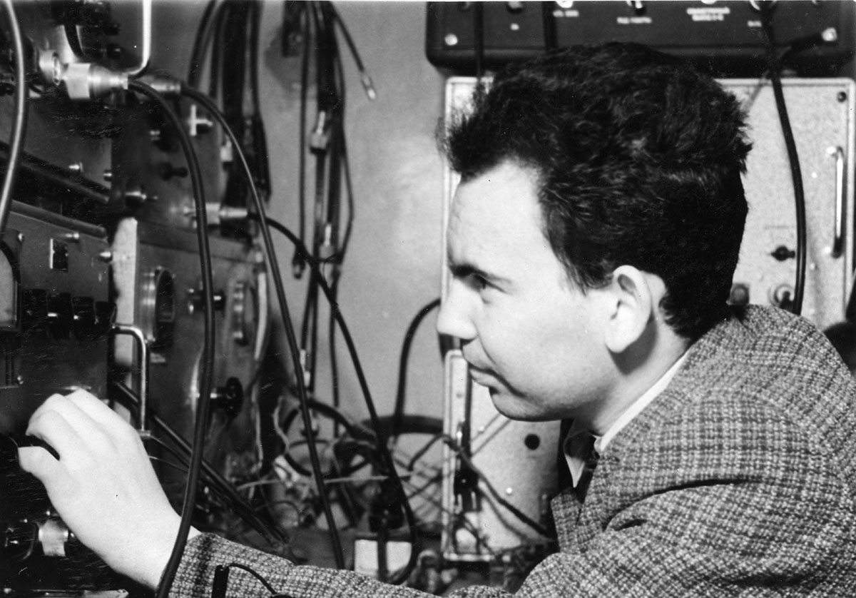 Когда ферромагнитный материал намагничивается, то одни его участки намагничиваются плавно, а другие скачками. От такого перемагничивания получающиеся импульсы дают очень важные сведения о структуре самого материала и его магнитных характеристиках. На снимке: Саланский Нахум Мойшович, младший научный сотрудник лаборатории физики магнитных явлений Института физики Сибирского отделения Академии наук СССР (СО АН СССР с 1991 года СО РАН), за установкой по импульсному перемагничиванию тонких магнитных пленок, фото 1962 года. Красноярск.