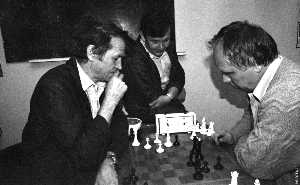 Шахматный турнир среди сотрудников лаборатории радиоспектроскопического структурного анализа Института физики им. Л.В. Киренского Сибирского отделения Академии наук СССР (ИФ СО АН СССР). Слева направо: Афанасьев М. Л., Меньшиков В. В., Попов М. А., 1983 год. Красноярск.