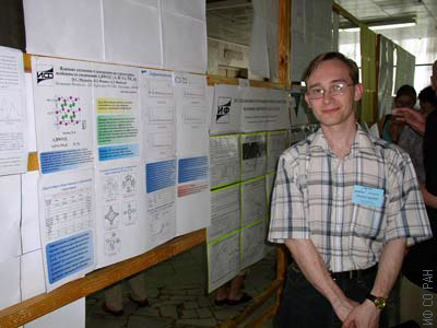 Молокеев Максим Сергеевич, научный сотрудник лаборатории кристаллофизики Института физики им. Л.В. Киренского Сибирского отделения Российской академии наук (ИФ СО РАН), у стендового доклада на VIII Всероссийской конференции по физике сегнетоэлектриков, Пенза 2008 год.