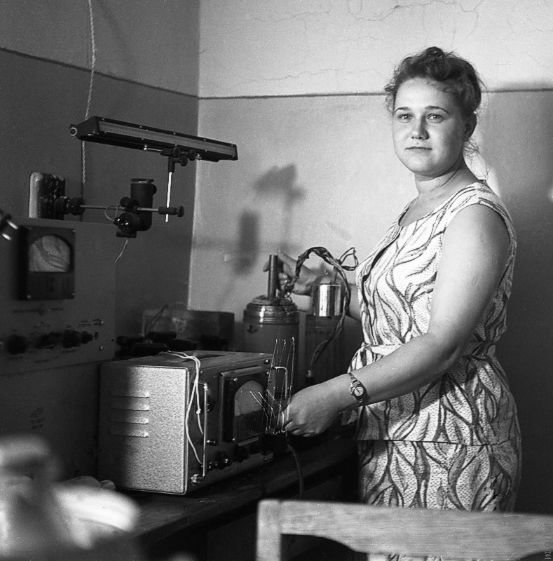 1971 год. Рябинкина Л. И., младший научный сотрудник лаборатории магнитных материалов Института физики им. Л.В. Киренского Сибирского отделения Академии наук СССР (ИФ СО АН СССР), за установкой по измерению электросопротивления ферритов мостовым компенсационным методом. Красноярск.