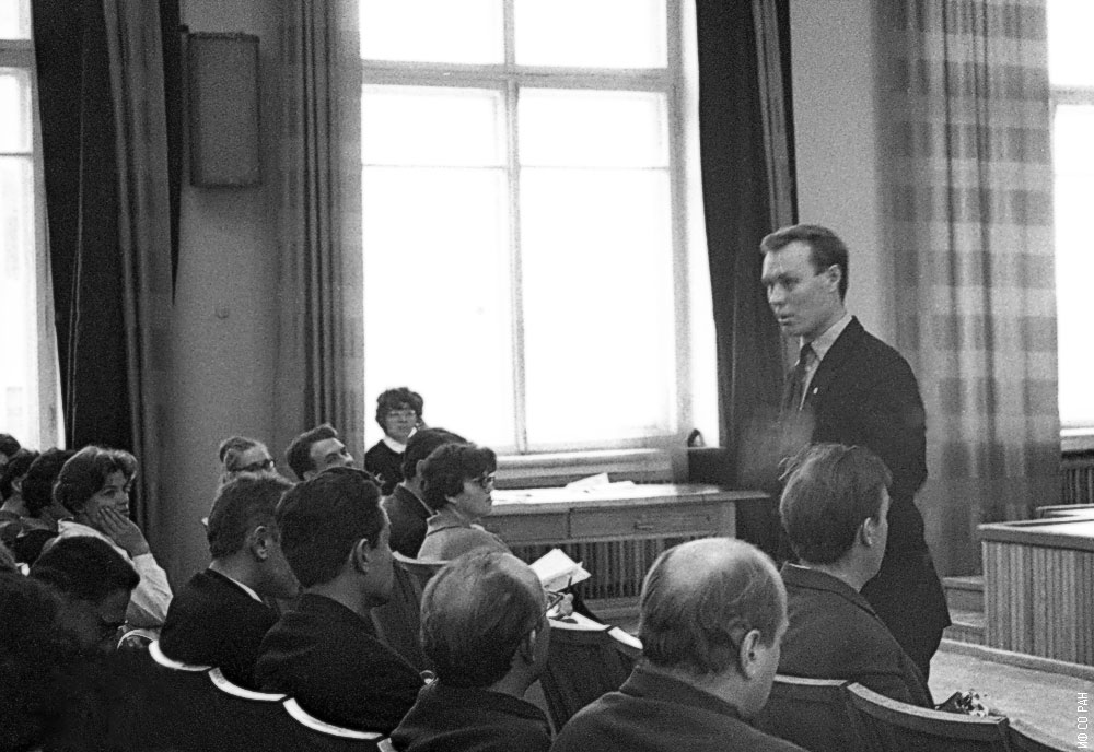 Хрусталев Борис Петрович , сотрудник лаборатории высокочастотных и импульсных свойств тонких магнитных пленок Института физики Сибирского отделения Академии наук СССР, 12 января 1970 года защитил диссертацию на соискание ученой степени кандидата физико-математических наук. На снимке момент ответов на вопросы. Красноярск.