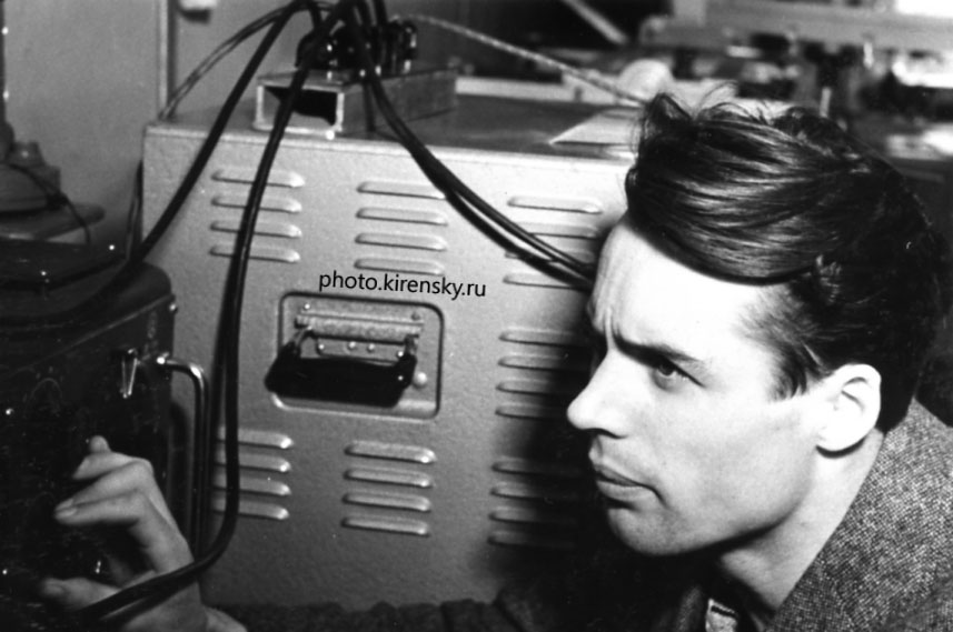 1962 год. И.П. Талашкевич, аспирант Института физики Сибирского отделения Академии наук СССР (ИФ СО АН СССР), у установки для изучения влияния текстуры, вызванной пластической деформацией при протяжке, на упругие свойства поликристаллических материалов.