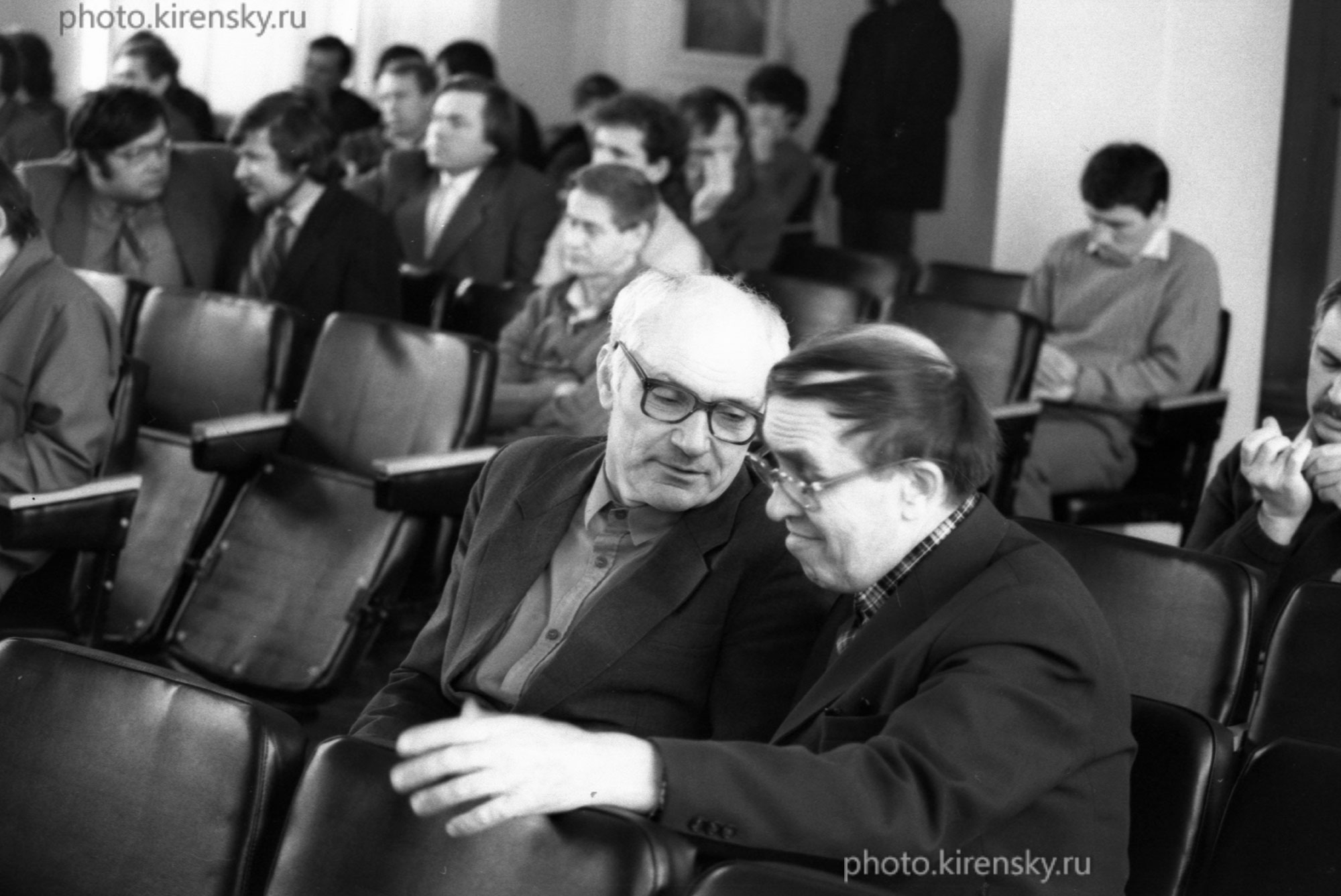 1998 год. Безносиков Б.В. (справа), старший научный сотрудник лаборатории кристаллофизики и Безматерных Л.Н., заведующий лабораторией магнитных материалов Института физики им. Л.В. Киренского Сибирского отделения Российской академии наук (ИФ СО РАН) в конференц-зале института. Красноярск.
