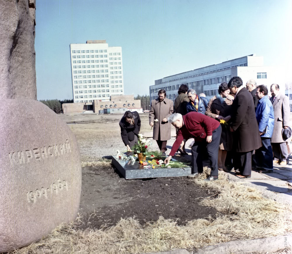 Возложение венков на могиле Л.В.Киренского в дни научных чтений, проводимых в институте в его память, 1986 г.