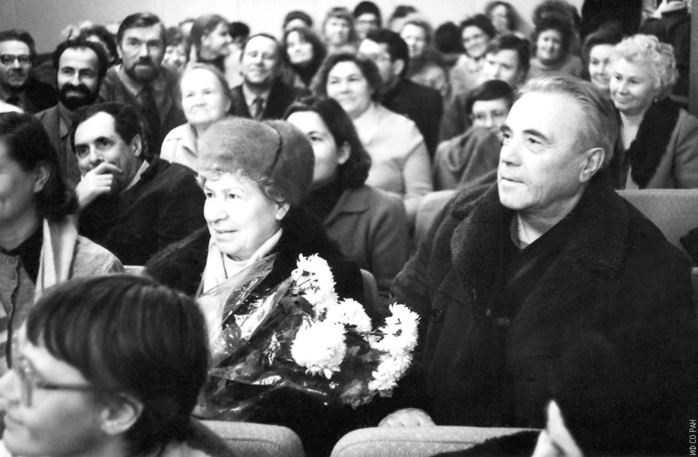 Встреча с Виктором Петровичем Астафьевым в конференц-зале института (крайний справа), рядом с ним его супруга Мария Семеновна, фото ноябрь 1987 года.