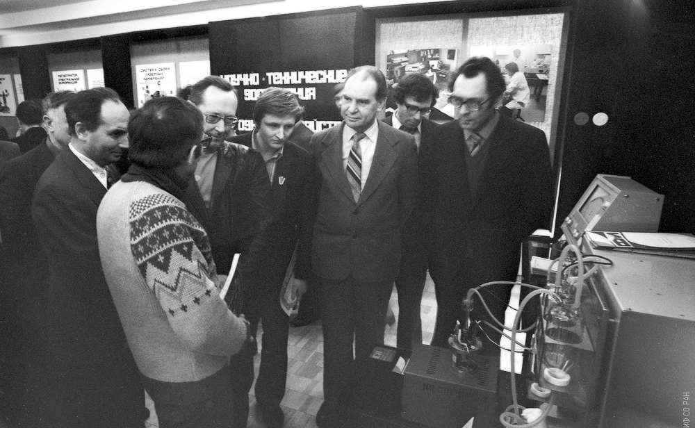 В Доме ученых Новосибирского Академгородка проходила выставка «Сибирский прибор-83». У прибора, представленного Институтом физики им. Л.В. Киренского Сибирского отделения Академии наук СССР (ИФ СО АН СССР), третий слева - Александров К.С., директор Института физики, крайний справа - Якубайлик Э.К. сотрудник Института физики. Новосибирск, 1983 год.