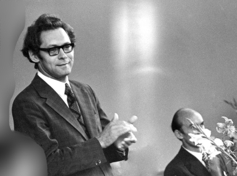 Якубайлик Эдуард Константинович поздравляет сотрудников Института физики им. Л.В. Киренского Сибирского отделения Академии наук СССР (ИФ СО АН СССР), участников торжественного заседания в честь годовщины Октябрьской революции, ноябрь 1974 года. Красноярск.