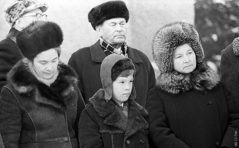 На открытие памятника 4 ноября 1974 года академику Л.В. Киренскому, организатору и первому директору Института физики им. Л.В. Киренского Сибирского отделения Российской академии наук (ИФ СО РАН), из Москвы приезжали его ближайшие родственники – дочь Татьяна (слева), внук и супруга Зинаида Яковлевна. Стоит за внуком: Р.Г. Руха, академик Туркменской Академии наук, друг Леонида Васильевича со студенческих лет. Леонид Васильевич похоронен на территории Института физики в Академгородке Красноярска.