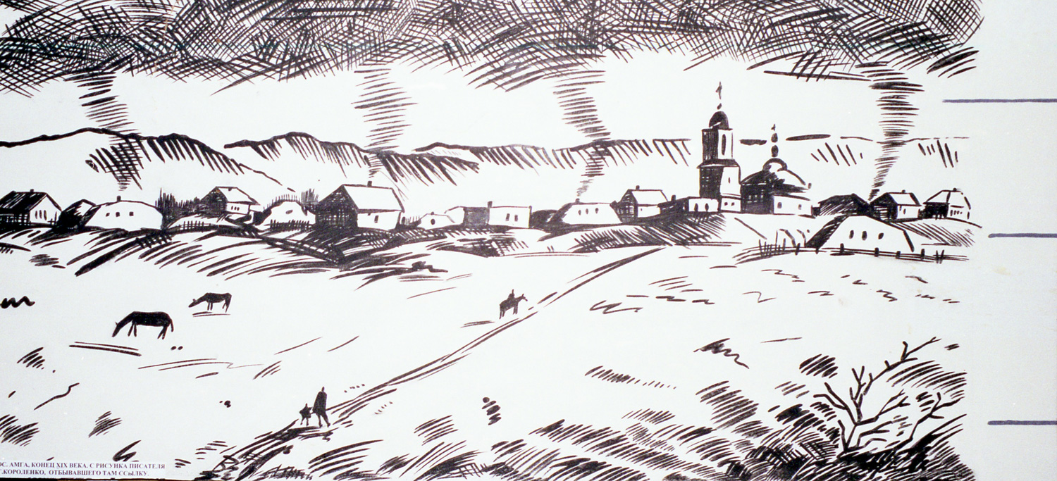 Село Амга (Якутия) - родина академика Л.В. Киренского, организатора и первого директора Института физики им. Л.В. Киренского Сибирского отделения Российской академии наук (ИФ СО РАН). С рисунка писателя В.Г. Короленко, отбывавшего ссылку в селе Амга Якутской АССР в конце XIX века.