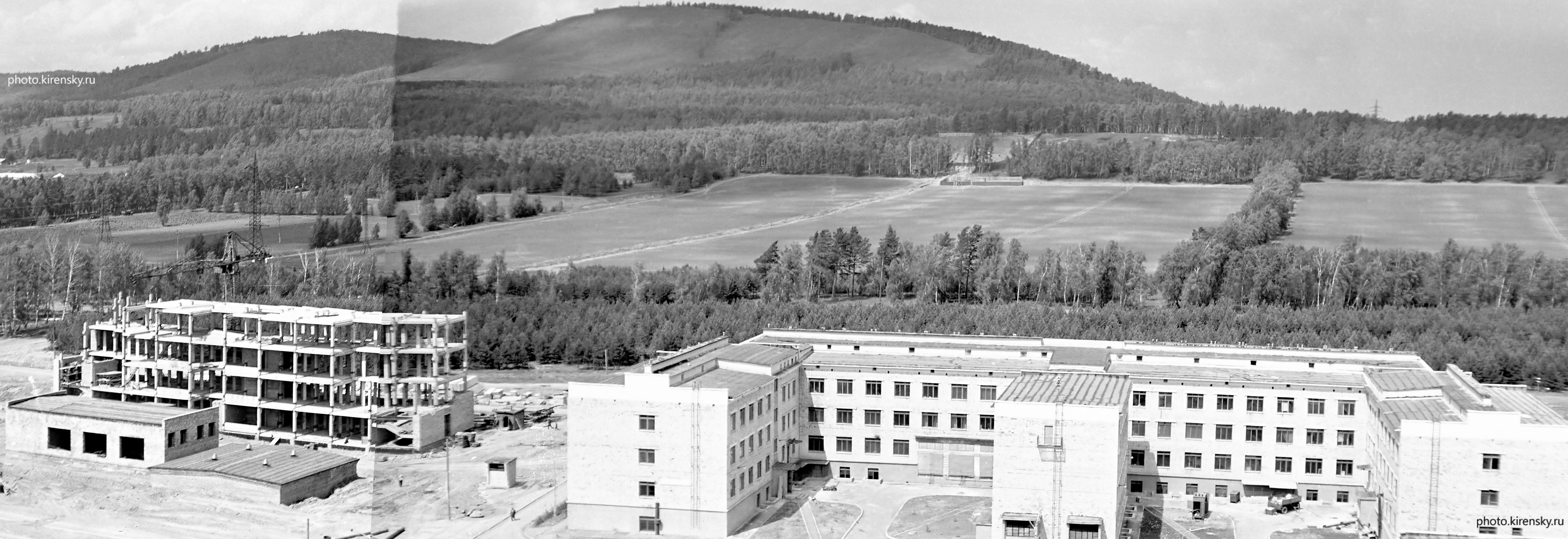 На снимке начало строительства здания отдела биофизики ИФ. Сдано здание в эксплуатацию в 1969 году. В 1981 году на базе отдела биофизики института организован Институт биофизики СО АН СССР.