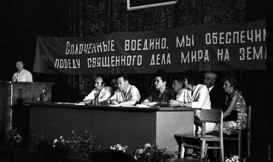 1961 год. Красноярский краевой комитет защиты мира проводил конференцию трудящихся Красноярска. В президиуме конференции председатель краевого комитета защиты мира Л.В. Киренский (второй слева), который в течение 20-ти лет возглавлял комитет (1949-1969 годы).