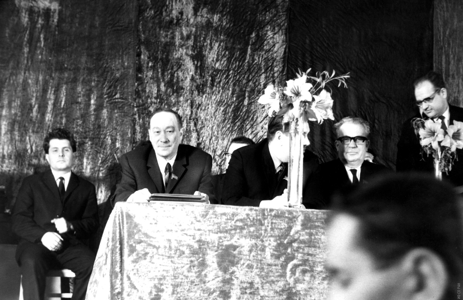 1960 год. Академик Л.В. Киренский (второй слева) в президиуме конференции участников движения за мир, проводимой Красноярским краевым комитетом защиты мира, председателем которого он являлся с 1949 по 1969 год. Красноярск.