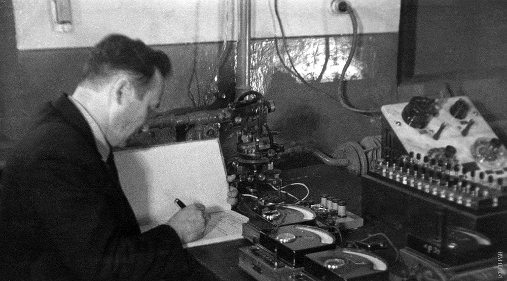 в созданной им магнитной лаборатории Красноярского государственного педагогического института, На базе магнитной лаборатории в Красноярске был организован первый академический институт - Институт физики. Снимок 1950 года.