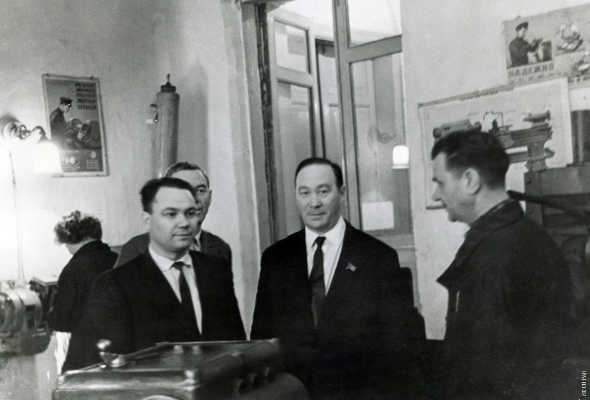 Л.В. Киренский (в центре), организатор и первый директор Института физики Сибирского отделения Академии наук СССР (в центре), будучи на первом Международном симпозиуме по физике магнитных пленок в Иркутске. Такой симпозиум был организован и проведен Институтом физики совместно с Иркутским государственным педагогическим институтом в 1968 году по поручению Совета Министров СССР по науке и технике. Он был первым в СССР и третьим в мире. Поскольку пленочное состояние вещества в те годы привлекало не только внимание исследователей, но и решительно вторгалось в технику, был создан Интернациональный организационный комитет по тонким магнитным пленкам под председательством профессора Л. Валенты. По решению комитета (начиная с 1964 года) каждые два года проводились такие Международные коллоквиумы. Первый такой коллоквиум был проведен в 1964 году в ......, второй в 1966 году в городе Йена в Германской Демократической Республике, третий в городе Иркутск в СССР. Красноярск в то время был закрытым городом для иностранных ученых. Слева В.А. Буравихин.