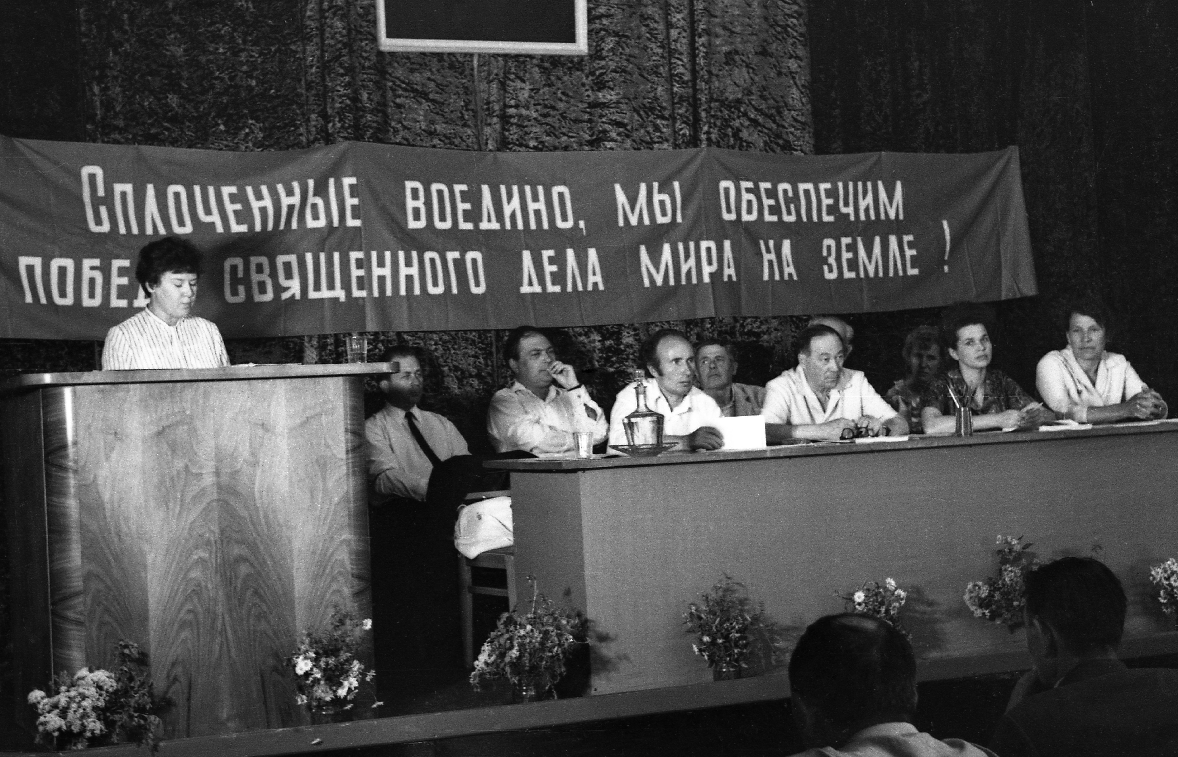 1961 год. Красноярский краевой комитет защиты мира проводил конференцию трудящихся Красноярска. В президиуме конференции председатель краевого комитета защиты мира Л.В. Киренский (второй слева), который в течение 20-ти лет возглавлял комитет (1949-1969 годы).