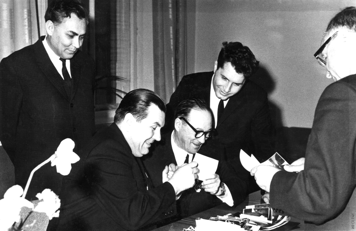 7 апреля 1969 года академику Л.В. Киренскому, организатору и первому директору Института физики Сибирского отделения Академии наук СССР (ИФ СО АН СССР) исполнилось 60 лет. Снимок сделан в кабинете Леонида Васильевича в день юбилея. Стоят: И.А. Терсков (слева), заместитель директора по научной работе института и Ю.В. Захаров, ученый секретарь института. Сидят: председатель Красноярского краевого исполнительного комитета Н.Ф. Татарчук (слева) и Л.В. Киренский. Красноярск.